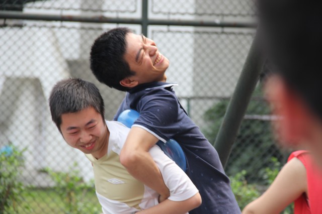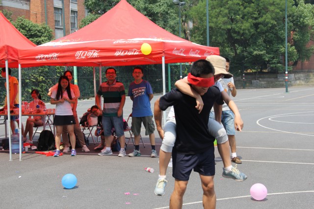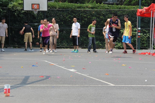 第四项比赛是穿越雷区,要求每组派出两名队员,一人背一人。背人者蒙眼,在背上队友的指挥下踩爆8个气球,完成规定赛道,计时短者胜。这项比赛真正印证了“不怕神一样的对手,就怕猪一样的队友”。背上同学指挥的好坏直接决定了比赛的结果。“土豪和他的小伙伴们”队采取了慢慢转圈和快速移动的战略,加上队友之间的默契配合,最终以30秒的惊人成绩完成比赛,被誉为“开挂了的神队”。最后一个项目是以接力的方式投竹筷,拼的是快速奔跑之后的投壶准确性,最终,“少年先锋”队以不到0.5秒的微弱优势力克具有百米短跑健将朱良杰同学的“MMY”队,获得了此项第一名。