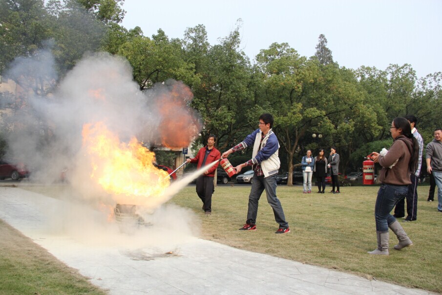 随后大家回到各自的实验室,随着火灾报警铃声响起,开始了正式的实习演练。所有师生用毛巾捂住嘴和鼻,紧张而有序地从楼中撤离,最后大家安全到达露天平地上。在这里,保卫处的老师又给大家讲解了火灾现场扑救的要领,演示了灭火器的正确和有效的操作方法。师生们纷纷拿起灭火器,认真投入到灭火演练中。
