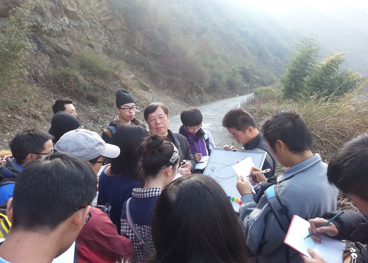 为了提高地球信息科学与技术专业学生的感性认识和野外分析问题的能力,负责《构造分析基础》教学的沈晓华教授和负责《沉积学与古地理学》教学的肖安成教授及本科教学秘书邓素清老师放弃了2015年元旦新年假期,带领地球信息科学与技术专业2012级学生到诸暨市陈蔡镇野外地质剖面和临安市於潜镇野外地质剖面分别就韧性构造变形和浙西早古生代沉积特征进行课间野外实习。两位老师冒着严寒认真讲解野外地质现象,对学生提出的问题逐一进行仔细的解答;学生们对野外地质现象表现很高的热情,仔细分析野外地质现象,并积极提出各种问题。通过这次野外课间实习学生们系统地掌握了韧性变形的野外变现特征、形成的条件、运动学标志及其浙西早古生代的沉积特征、沉积构造和沉积演化等,提高学生对这些现象的识别能力和野外分析能力。