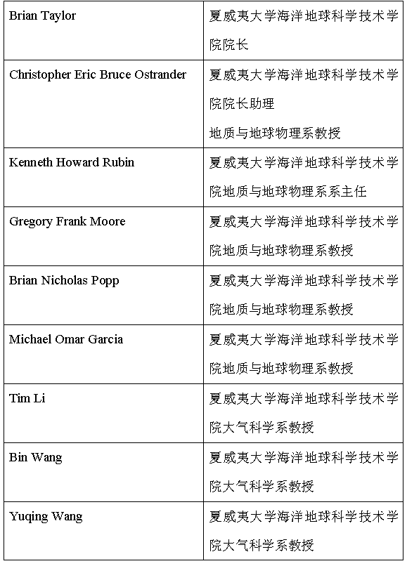 2. 参加研讨会的夏威夷代表团成员名单 威尼斯7026官网-夏威夷大学地球科学前沿中美双边 研讨会外方主要代表名单3. 威尼斯7026官网地球科学系与夏威夷大学海洋与威尼斯7026官网3+X理学硕士联合培养协议(签订合作书)