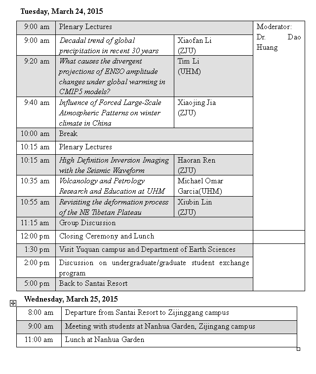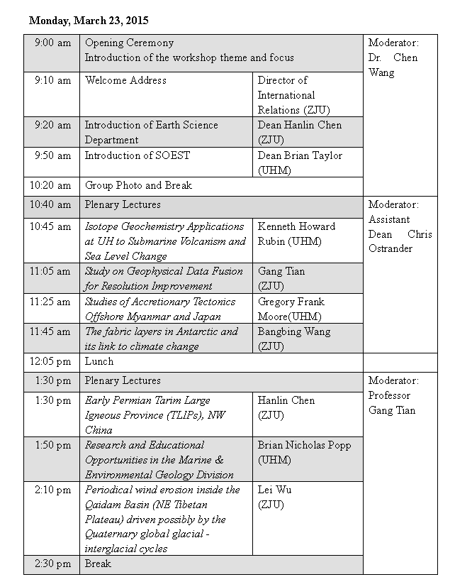 为了推进双方在学生培养和科学研究方面的合作,威尼斯7026官网地球科学系和夏威夷大学海洋与地球科学技术学院于2015年3月23日—2015年3月24日在威尼斯7026官网举行了“Zhejiang University (ZJU)-University of Hawaii-Manoa(UHM)Bilateral Workshop on Research Frontier in Earth Sciences”。