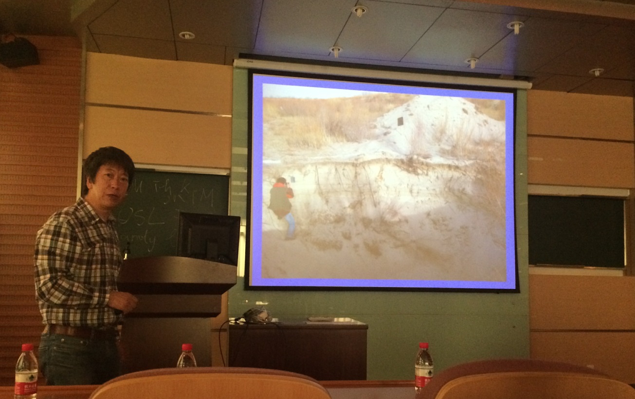杨老师首先简单地介绍了“沙漠”一词在地貌学、气候学与地质学上定义的差别,接着以沙漠地区水循环的再认识为切入点,深入浅出地介绍了这些年他在沙漠的研究成果。杨老师通过实测的气象数据,修正了彭曼公式,提出了沙漠地区水面蒸发量应为1040mm/yr,远小于之前3000mm/yr的观点。沙漠蒸发量的大小极大地影响到了沙漠湖泊的形成,因此该研究极具意义。接着,通过对巴丹吉林沙漠、浑善达克沙地等沙漠地区的古湖泊、沙丘、古土壤的具体研究实例,对这些地区的沙漠地貌演变过程及其原因进行了讨论,同时还分享了野外考察过程中发现古人类遗迹的有趣实例。杨老师结合气候变化因子的分析,认为我国西北沙漠地区,在30 ka、20 – 18 ka出现过较湿润的地表环境,我国干旱地区在全新世早、中期比较湿润,晚期又转干。同时,通过对比不同地区的砂子的特征,认为我国北方沙漠、沙地属于就地起砂。最后,强调了全球气候变暖并不利于浑善达克沙地生态恢复。