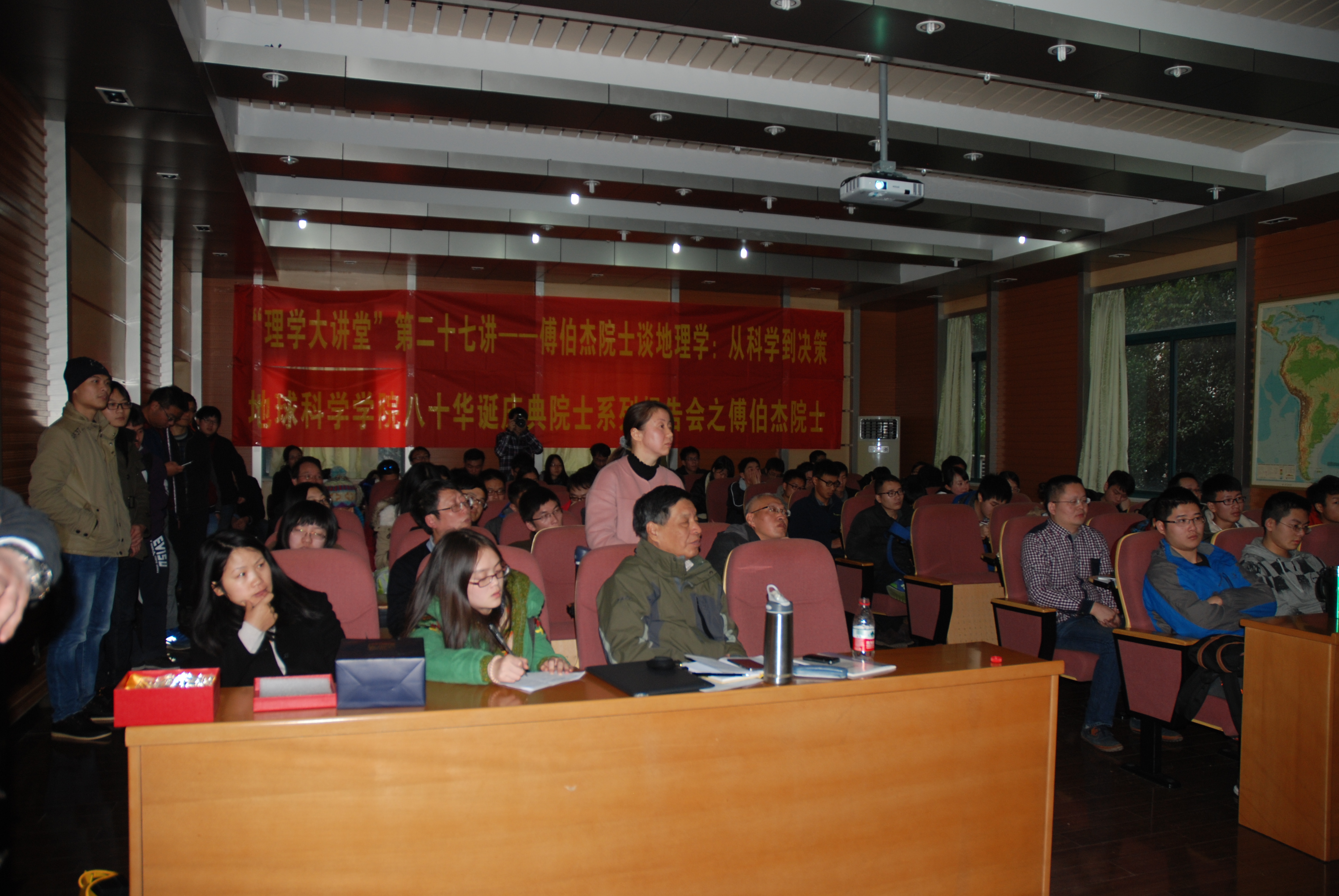 傅伯杰院士与师生们就地表各圈层的相互作用、地球关键带研究、地球系统科学学科发展等问题进行了深入交流。傅伯杰院士以其渊博的知识、国际化的视野、前沿的理念和切实的案例让在场的师生对地理科学的发展有了更新更深入的认识,对地理学探索自然规律、昭示人文精华、支持科学决策、致力于未来地球可持续发展的使命和作用有了更深的理解,博得了全场师生的阵阵掌声。