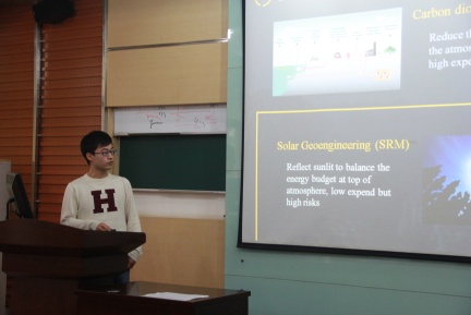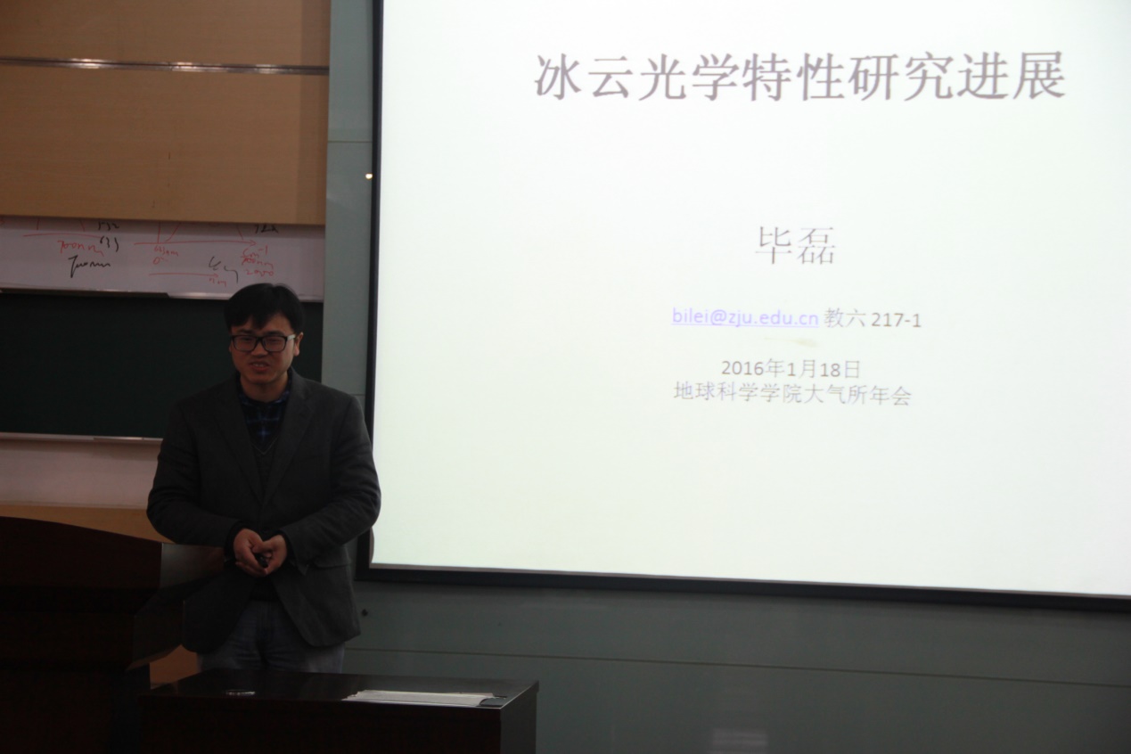 接下来是年会的主体部分,由四位老师和四位研究生分别就各自的研究领域进行了学术报告。在四位老师中,首先是毕磊教授对冰云光学特性研究领域的进展进行了介绍,接下来是由环资学院的高超超教授带来了题为《Volcanic Monsoon Influence Revealed from Multi-proxy Evidence》的报告,然后是田荣湘教授对太阳辐射和能量变化在青藏高原季节变化中的作用进行了介绍,而后是黄艳艳老师向大家介绍了西太平洋副热带高压的年代际变化。此外,还有段磊同学、葛敬文同学、苏涛同学和李婷婷同学分别就气候变化与地球工程、中国冬季降水的年代际变化、重力波触发新对流的特征以及梅雨降水系统发展过程中的正压过程等研究方向作了学术报告。