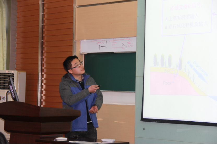 接下来是学院老师的报告,首先是陈生昌老师《再论地震数据偏移成像》的报告,主要介绍了他们基于现有的偏移成像公式中所存在的问题,对公式进行了修正和发展,并得到了更好的分析结果。张丰老师介绍了《高性能空间连接计算》,通过他们的工作使空间连接并行计算的计算效率有了明显提升。苏程老师的报告《数字流域分析进展》,像我们展示了流域计算过程中存在的问题与瓶颈,流域计算的五个过程都有很多需要改进的地方,以适应日益增长的需求以及更准确的结果。毕磊老师则是像我们介绍了《大气辐射与遥感:冰云和气溶胶的光学特性研究》相关内容。由于我们在以往计算中过于理想化冰晶、气溶胶等离子,使得虽然计算更加简单,但产生了较大误差,而发展新的例子光学特性库是辐射研究中亟待解决的问题。王琛老师《企业外部地理知识搜寻模式对创新的影响》报告通过缜密的逻辑和分析,像我们介绍了企业创新的相关问题。最后何敏新老师和饶刚老师分别为我们带来了关于《近两百年来黄河中上游乌梁苏湖生态演化和荒漠化的生物标志物记录》和《鄂尔多斯周缘活动断层及地震相关研究》的报告。