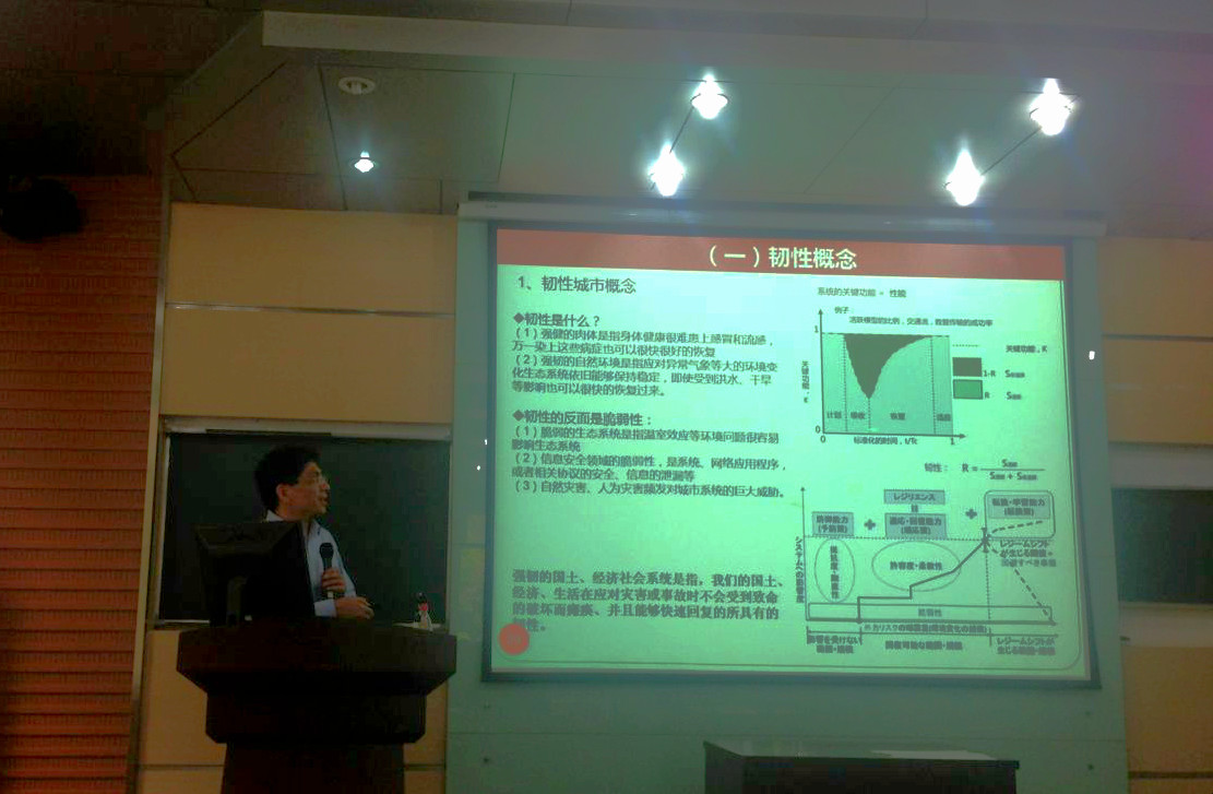 翟教授指出,资源有限的客观条件决定了新常态背景下城市防灾规划要从“防灾”、“减灾”向“韧性城市”发展。他用韧性城市的先驱者——日本的相关规划制定为例,介绍了韧性城市的定义以及其在实际操作中的体现。之后,翟教授介绍了国内外现有的韧性评估方法,包括以原因为基础的因子综合评估法,以及结果为导向的终极评估法。为了加深理解,翟教授介绍了他主持的三个研究项目。其一是深圳福田区的灾害风险评估报告,其二是合肥市洪灾分析与应急预案的建立,其三为基于韧性的灾后区域经济增长模式研究——以汶川地震为例。教授对韧性指数做了很好的定量计算,研究结果拥有较强的现实启发性。