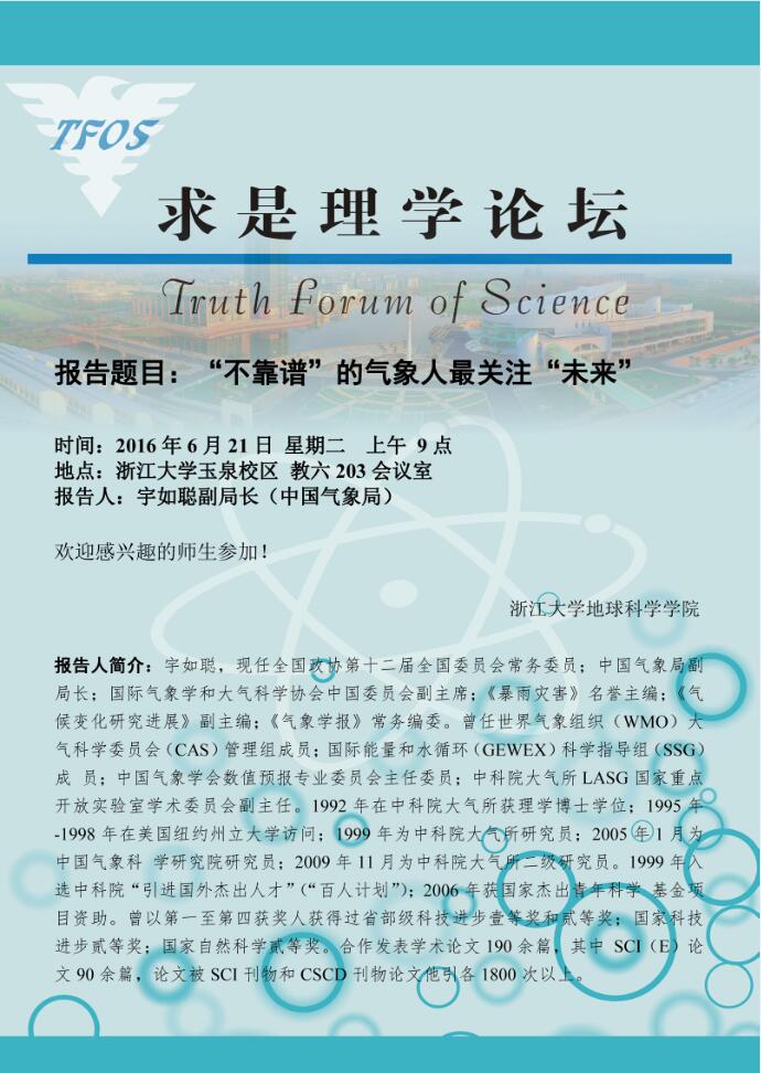 求是理学论坛――中国气象局宇如聪副局长学术报告通知
