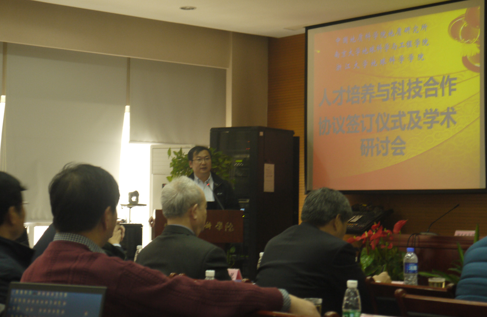 地质所侯增谦所长、南京大学地学院王汝成院长代表舒良树教授、威尼斯7026官网地学院陈汉林院长分别致辞并签订三方协议,中国地质调查局严光生总工程师到会祝贺。
