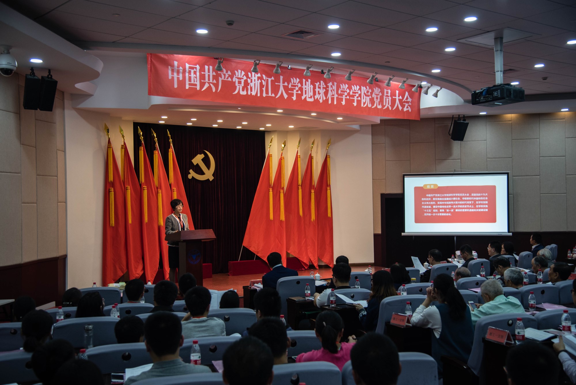 校党委副书记叶民对本次大会的召开表示祝贺并预祝大会圆满成功,并向向大会全体党员和学院全体师生员工致以诚挚的问候。他充分肯定了地科学院党委带领学院全体党员和师生员工在学院建设发展中取得的成绩,同时就本次换届选举和下一步的党建工作提出了三点希望和要求:一是希望参会的全体党员认真审议工作报告,认真负责地选举新一届学院党委委员、纪委委员和校党代会代表;二是希望新一届党委高举中国特色社会主义旗帜,紧密团结在以习近平同志为核心的党中央周围,带领全院党员深入学习贯彻十九大精神,充分发挥学院党委的政治核心和保证监督作用,进一步提高党建和思想政治工作科学化水平;三是要继续加强领导班子建设,加强党支部建设和党员队伍建设,围绕浙大“双一流”建设目标,加快建设世界一流地学学科。