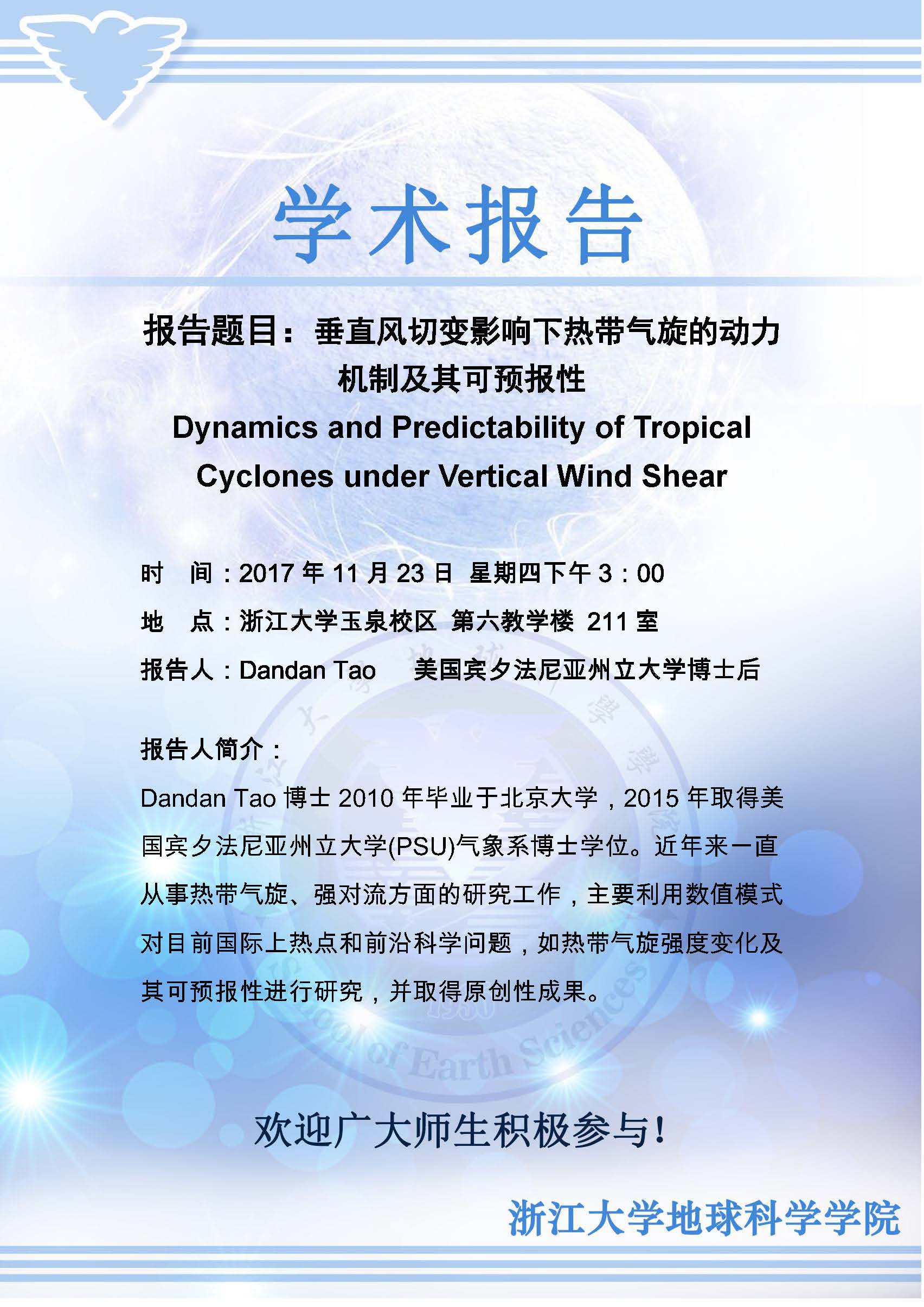 美国宾夕法尼亚州立大学Dandan Tao博士后学术报告通知