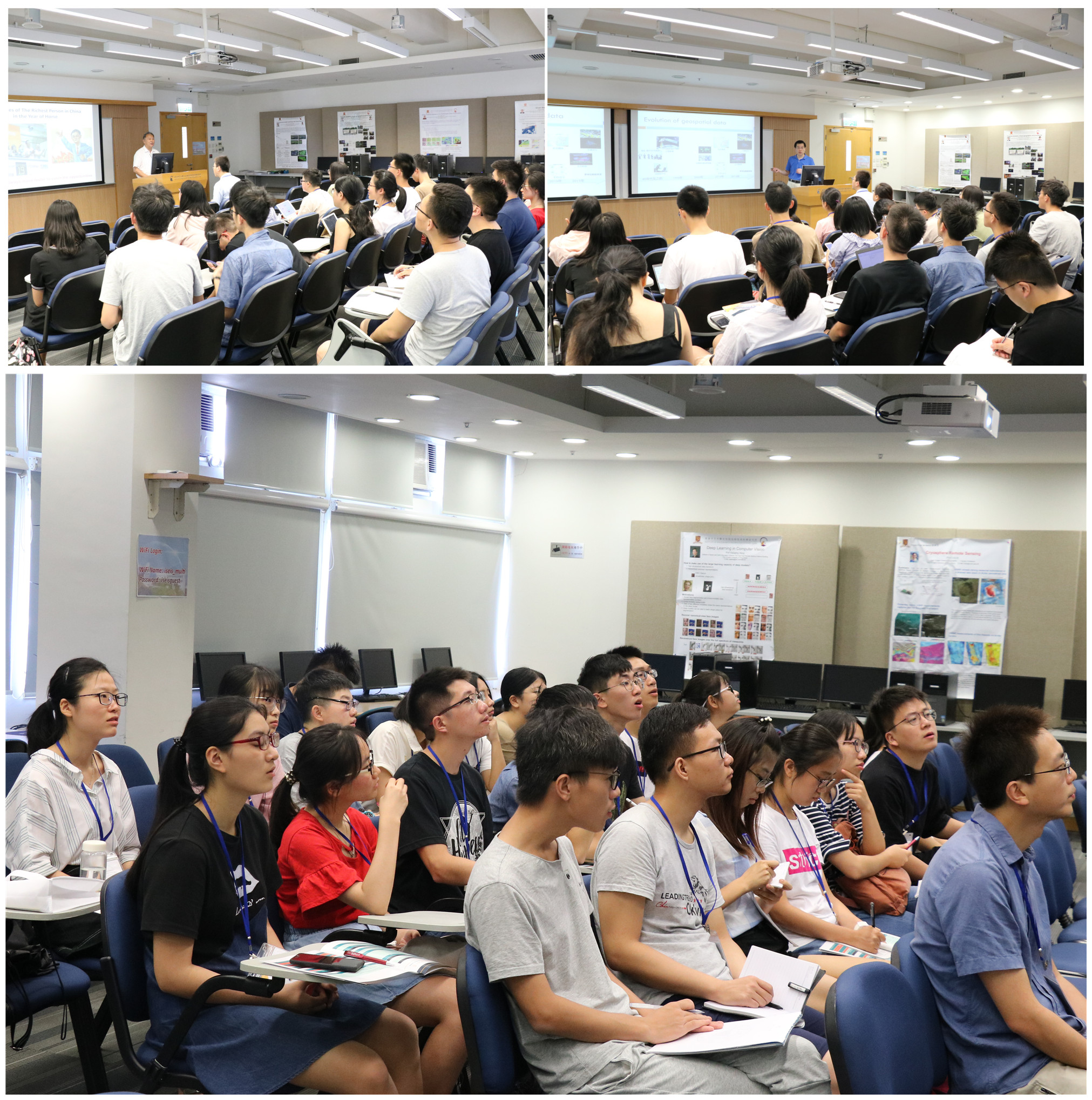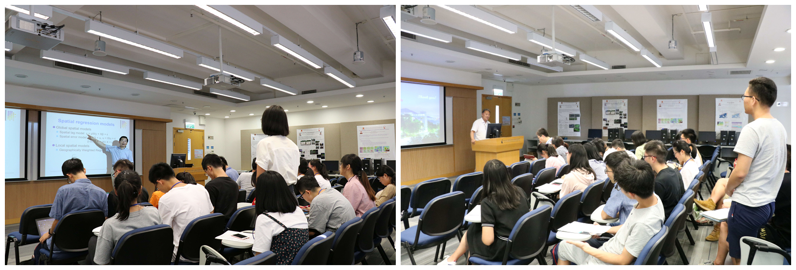 ISEIS所长林珲教授、副所长黄波教授等先后做了时空数据模型与GTWR分析模型、多分辨率图像融合方法、大数据在城市土地利用规划中的应用、GIS的发展为主题的全英文报告。报告内容深入浅出,将时空数据组织、时空数据处理、时空数据分析应用串联起来,展示了GIS时空分析领域的前沿研究;以虚拟地理环境(VGE)为主题畅谈了未来空间科学的发展前景。报告既有前沿新理论方法的介绍,也有宏观愿景的展望,拓展了同学们对地理信息新技术和新方法的认知,引发了他们对专业知识和相关问题更开放性的思考。