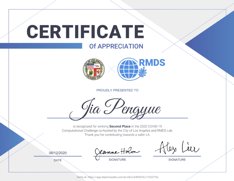 在威尼斯官网副教授张丰的悉心指导下,地理信息科学专业的贾鹏越同学带领团队“当代李时珍”荣获第二名。在zoom平台举行的线上颁奖仪式上,洛杉矶市副市长Miguel Sangalang亲自为贾鹏越团队颁奖。团队还获得了1000美元的现金奖励以及来自洛杉矶市政府、加州大学洛杉矶分校Computational Medicine学系及其他合作伙伴的实习机会,成果报告将被推荐发表在Harvard Data Science Review杂志,并将在大数据人工智能创新方法2020年度国际峰会(IM Data)上进行成果展示。