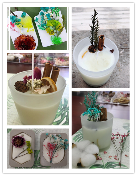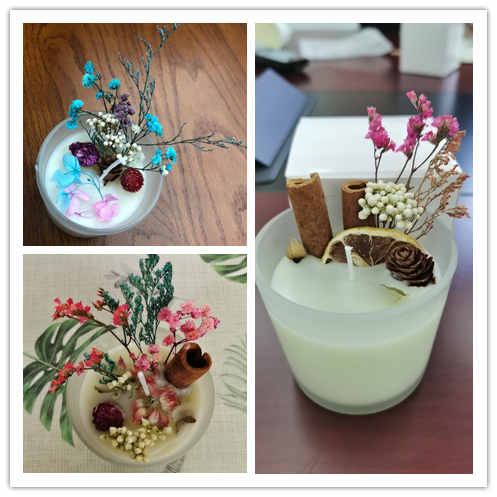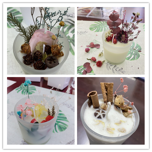 活动现场芳香四溢,在老师的指导下,大家首先把豆蜡倒入煮蜡锅中加热,再将融化的豆蜡导入纸杯冷却,待豆蜡温热后滴入8-10滴香薰精油,之后将蜡倒入蜡烛杯插入蜡心或将蜡倒入腊牌模具,接着从几十款花材中根据喜好挑选,构思造型,在蜡凝固前分层摆放,修饰装点,所有装饰完成后就静静等待蜡完全凝固,一款高颜值的手作作品就诞生啦。