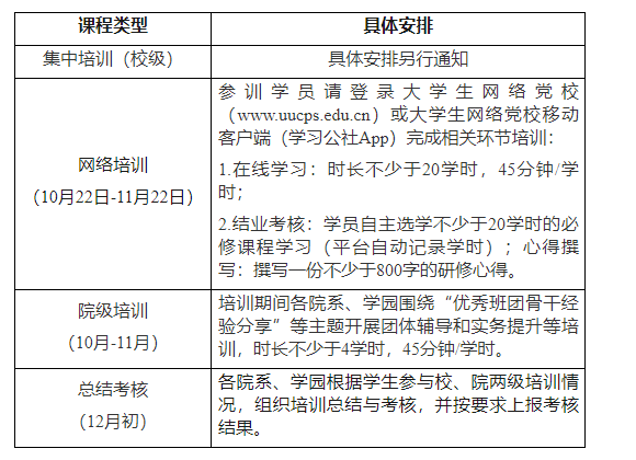 1.本次培训集中培训和网络培训由学工部、团委统一组织,包含“理论培训”“班团管理培训”和“实务培训”;院级培训由院系、学园根据工作需要组织“团体辅导”“实务培训”和“总结考核”等内容。