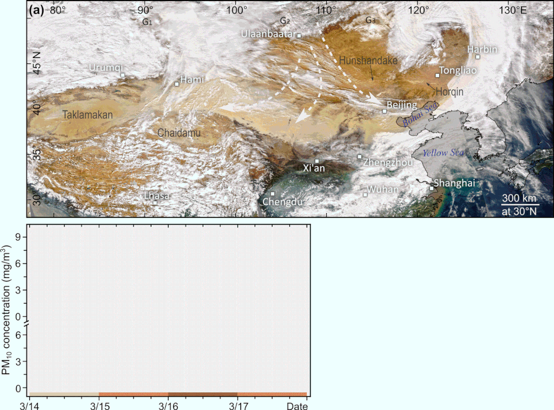 当沙尘暴发生时,西起嘉峪关、东至济南横跨1600多公里的不同地点的降尘,都成为了团队的研究对象。杨小平介绍,团队利用高时间分辨率的遥感数据、实时气象数据,并结合所获珍贵样品的微量/稀土元素组成、锶-钕(Sr-Nd)同位素比值等数据,对这次沙尘暴事件进行了系统分析。