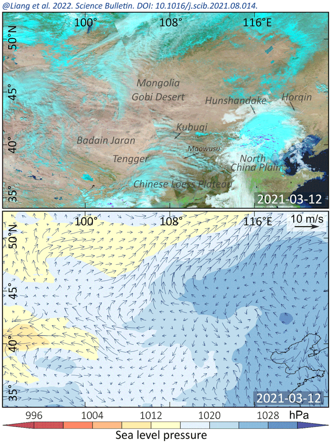 2021年特大沙尘暴沙尘起源、实时传输路径