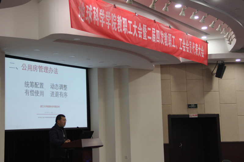 党委委员王华军就学院新大楼的建设情况作工作报告,他介绍了新大楼的概况、学院公用房管理办法和分配方案,展示了新大楼的空间布局和公共区域装修风格,并就学院搬迁进程、装修申请流程做了具体介绍。