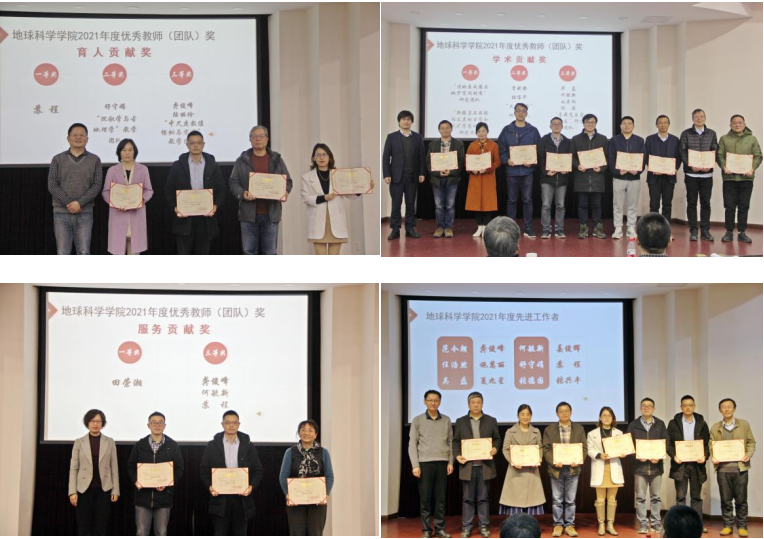会上表彰了学院2021年度优秀教师(团队) “育人贡献奖”、“学术贡献奖”、“服务贡献奖”和学院2021年度先进工作者。副院长曹龙、副院长杜震洪、党委书记王苑、院长夏群科为获得表彰的教师和团队代表颁奖。