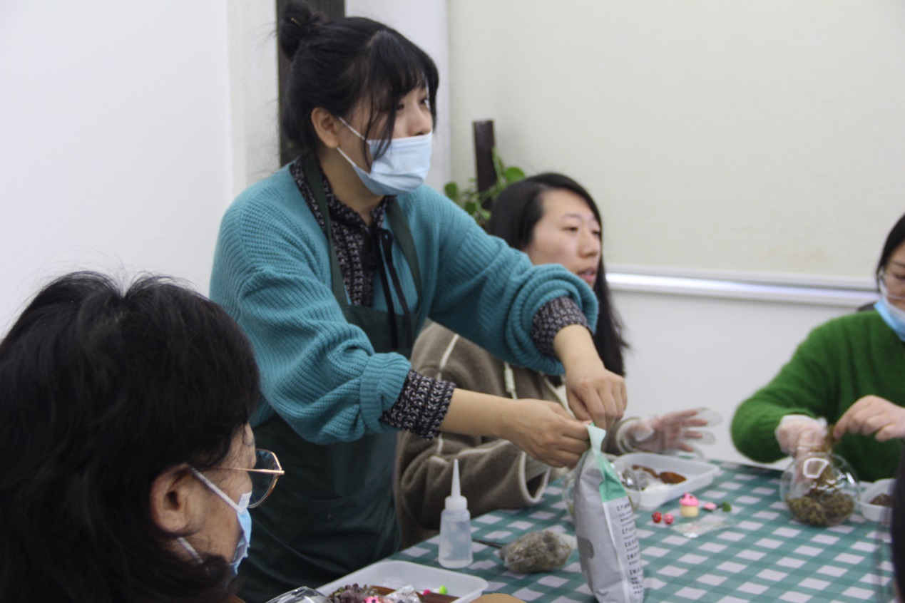 首先,手作老师为老师们讲述了制作多肉植物微景观的基本步骤:将苔藓放入景观瓶中,后加入适量泥土,选取合适位置埋入多肉,最后利用手中材料,发挥创意,随心装点景观瓶。