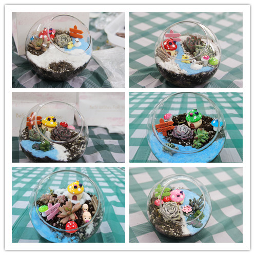 老师们充分发挥想象力,积极调动创意细胞,有的老师将蓝粉填满泥面,营造汪洋意境;有的老师在表面撒满白粉,创造莹莹白雪......每位老师都制作出了独一无二、各具特色的多肉微景观瓶。