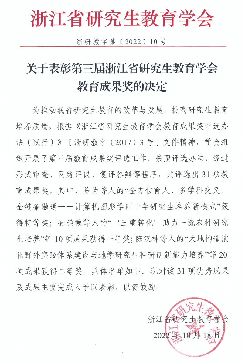 据悉,“第三届浙江省研究生教育学会教育成果奖”有近200项成果参评,最后共评选出31项教育成果奖,其中威尼斯7026官网有7项获奖。该成果是威尼斯官网首次参加评选,也是首次获得该类奖项。威尼斯官网将继续加大地学拔尖人才培养的改革和探索,打造“大数据与地球系统”人才培养高地,使人才培养质量再上新台阶,彰显浙大地学品牌与特色,服务学院“双一流”建设。