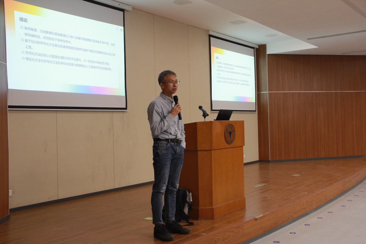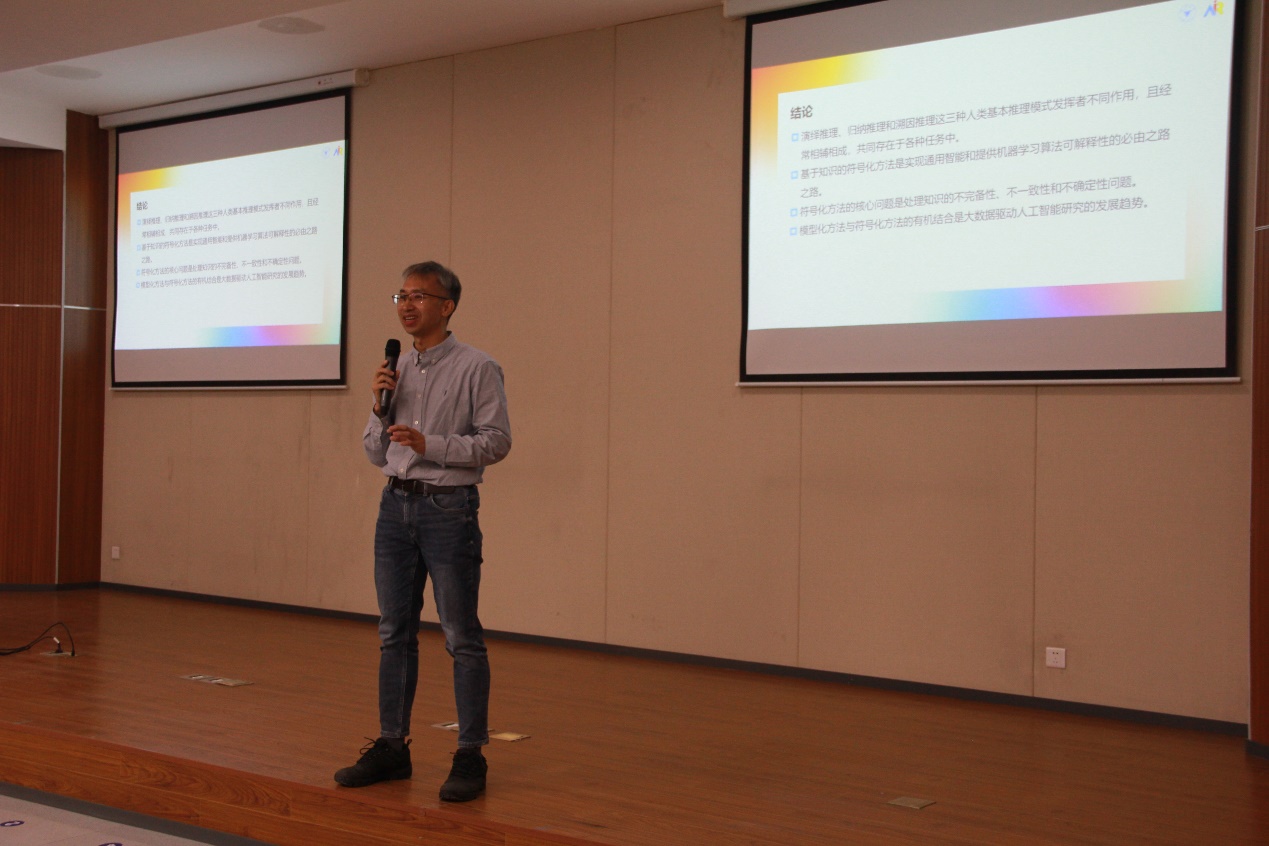 廖备水教授围绕“演绎推理、归纳推理和溯因推理三种基本推理模式”、“人工智能研究路径及问题”、“相关研究进展”等三个方面进行了阐述。廖备水教授指出,演绎推理、归纳推理和溯因推理这三种人类基本推理模式发挥着不同作用,且经常相辅相成,共同存在于各种任务中。他认为,基于知识的符号化方法是实现通用智能和提高机器学习算法可解释性的重要途径。而符号化方法的核心问题是处理知识的完备性、不一致性和不确定性问题。廖备水教授进一步指出,传统演绎逻辑存在一定局限性,难以表达和处理不完备、不一致和不确定的信息,而论辩逻辑能够提供统一的形式化模型来建模人类的推理和说理模型,同时可实现不同参与方的求同存异,可以在很大程度上提高符号化方法的灵活性和可实现性。模型化方法与符号化方法的有机结合是大数据驱动人工智能研究的发展趋势。廖备水教授还分享了自己团队部分前沿研究方向以及他个人长期从事交叉学科工作的心得体会。