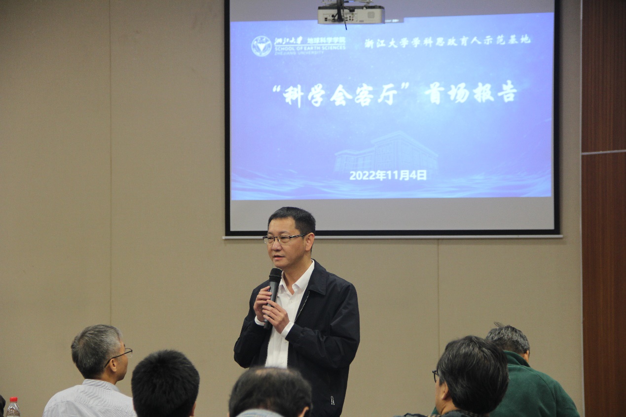 夏群科致报告会欢迎辞。他首先对廖备水教授的到来表示由衷的感谢。他指出,国内大学和国外大学的教学氛围差距之一在于师生的哲学素养和人文素养。青年研究者必须增强自己的哲学素养和人文素养,才能使自己的科研之路走得更快,走得更远。他希冀,以廖备水教授的报告为契机,通过“科学会客厅”系列讲座,激发广大师生对哲学、人文的兴趣,并主动将此融入到科学研究之中,从而让地学的研究范式、研究方法等得到一个提升。