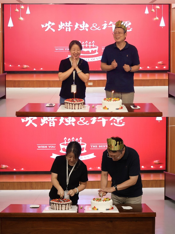 生日会上,张霄宇老师和田钢老师作为寿星代表,领唱生日歌、点蜡烛许愿、切蛋糕,寿星们边品尝蛋糕边分享工作生活中的乐事,现场洋溢着欢快而喜悦的氛围。