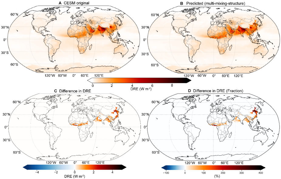 机器学习量化老化黑碳对辐射效应的增强机制,发现高污染区域黑碳直接辐射效应被低估。传统区域和全球模型通常采用体积平均或核壳结构来模拟内部混合黑碳颗粒的辐射效应,这与实际大气中的复杂混合结构差异较大。通过机器学习耦合CESM预测了多混合结构黑碳颗粒的全球DRE,本研究发现尽管全球平均DRE仅增加3.9%(从+0.285 Wm-²增至+0.296 Wm-²),但高污染区域DRE比传统CESM模拟结果高31.6%。本研究量化了黑碳复杂混合结构对全球气候的影响,为改进全球气候模拟提供了新范式。