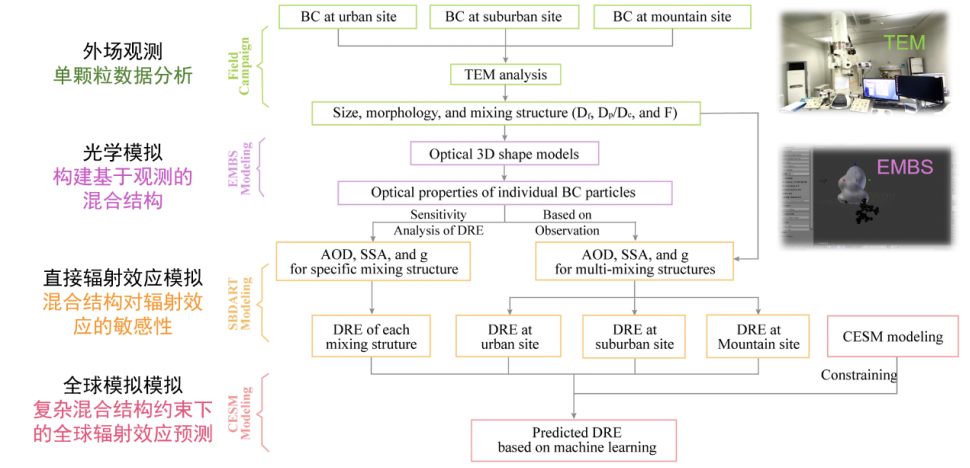 跨尺度方法框架:研究基于透射电镜图像进行三维光学建模和光学模拟(EMBS-DDA),从而构建基于外场观测的黑碳精细化微观结构光学表征数据库,同时结合机器学习(Radom Forest和Gradient Boosting Regressor)及大气辐射传输模型(SBDART),进行混合结构与辐射效应之间的关系训练,最后机器学习与地球系统模型(CESM)结合,获得复杂混合结构黑碳的直接辐射效应。