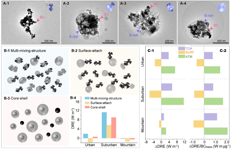 外场观测验证老化黑碳的辐射效应增强机制:基于城市、郊区和高山采样点的观测数据,研究模拟了基于观测的多混合结构和核-壳结构假设下的DRE,发现与核-壳情景相比,多混合结构情景下的DRE高24.9%至199.8%。高山采样点的单位质量黑碳的DRE增强效率较高,比城市和郊区分别高出50.6%和41.4%,这归因于该高山大气站点存在更多老化黑碳颗粒,它们具有更大的包裹程度和包裹层厚度。