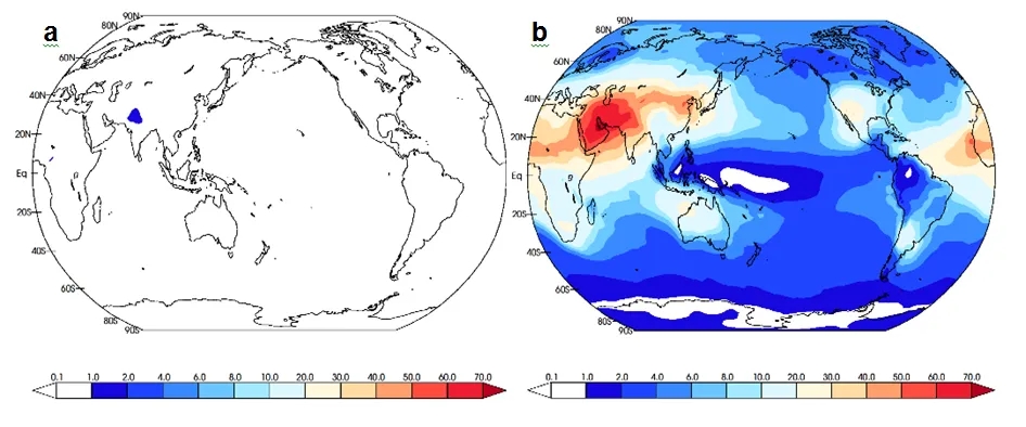 图3 全球大气化学模型模拟的超微米沙尘对二次有机气溶胶的贡献(a)基础模型模拟结果(b)改进模型模拟结果