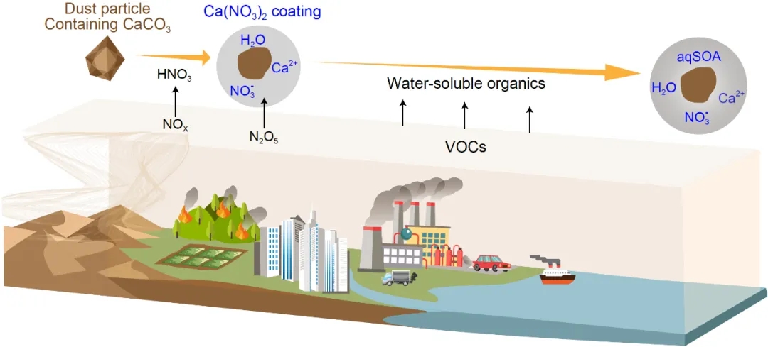 一项国际研究在空气污染形成过程中发现了一个令人惊讶的大气过程:老化沙尘颗粒表面的非均相反应生成大量二次有机气溶胶。与长期以来的科学认识不同,曾经被认为粒径过大且过于干燥而无法发生化学反应的大量沙尘颗粒,实际上充当着“大气中的化学反应器”——促进了液相二次有机气溶胶(aqSOA)的形成,从而影响空气质量和人类健康。
