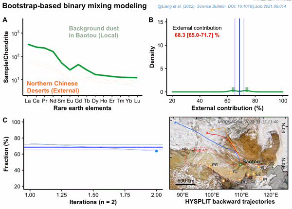 研究通过遥感与物源示踪技术证实,沙尘主要源自蒙古国中南部,呈辐射状向中国北方边境传播,且气团路径上的裸地比例显著影响粉尘强度。进一步利用稀土元素分布与自助法抽样技术,估算出包头地区粉尘的外部来源贡献约占74%(58%~82%)。结合Sr-Nd同位素端元混合模型与CALIPSO卫星观测,研究还表明,该次沙尘暴事件的大多数样品中远源的蒙古国贡献明显,而鄂尔多斯高原的库布齐沙漠和毛乌素沙地几乎没有贡献。