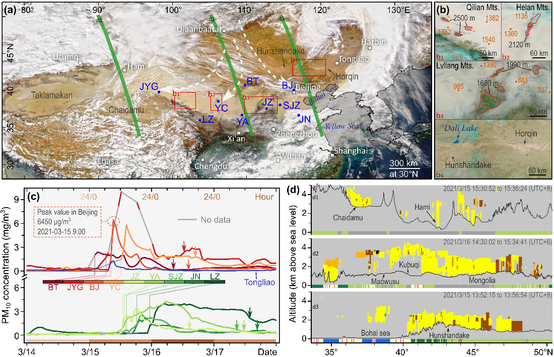 该论文针对2021年春季东亚特大沙尘暴事件,系统采集了西起嘉峪关、东至济南横跨1600公里区域的粉尘样品,结合高分辨率遥感与实时气象数据以及微量/稀土元素含量和Sr-Nd同位素比值分析,深入揭示了大规模沙尘天气的粉尘释放、传输与物质交换过程。