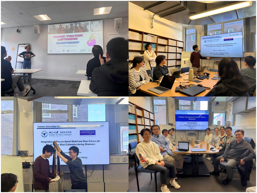 在为期两月的合作中,许鑫鹏同学还积极参加各种学术活动,包括城市气候研究组的内部组会、曼大地球与环境科学学院跨组会分享研讨会,以及来自其他高校如伯明翰大学的学术交流讲座等,内容涵盖城市气候模型前沿、机器学习在地球系统科学中的应用、城市环境,以及数据伦理与安全等。