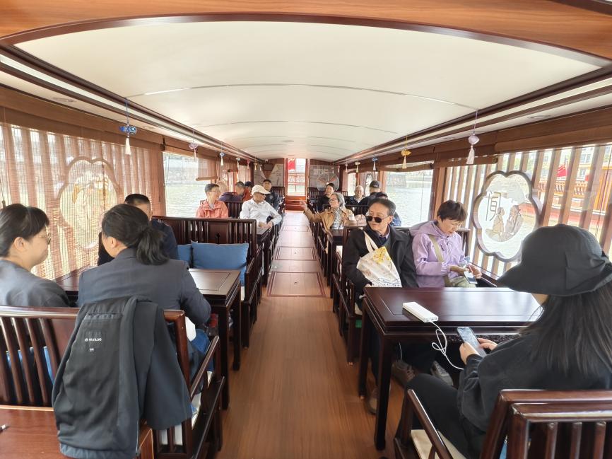 活动还安排了乘船游览环节。摇船晃晃悠悠,老教师们从流动的河水中,切身感受塘栖“因河而兴”的悠久历史与水乡发展的蓬勃朝气。
